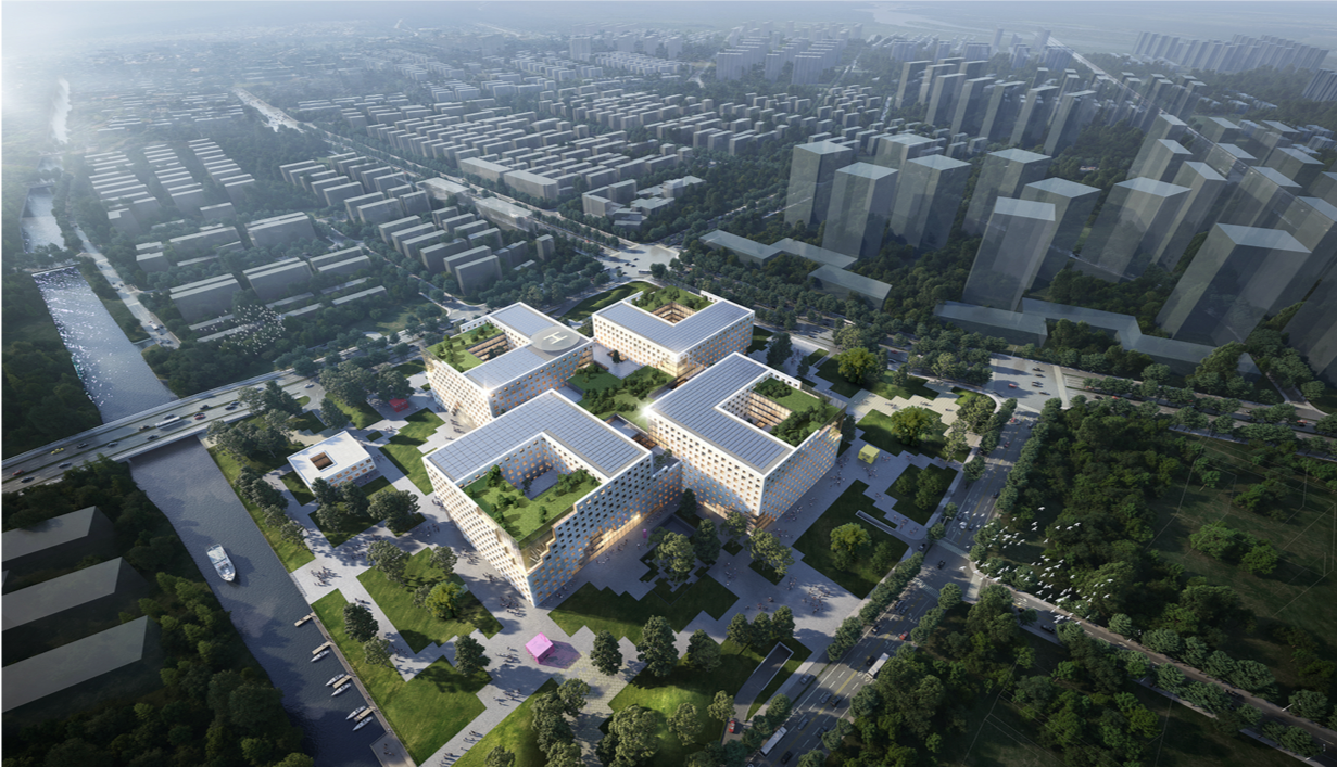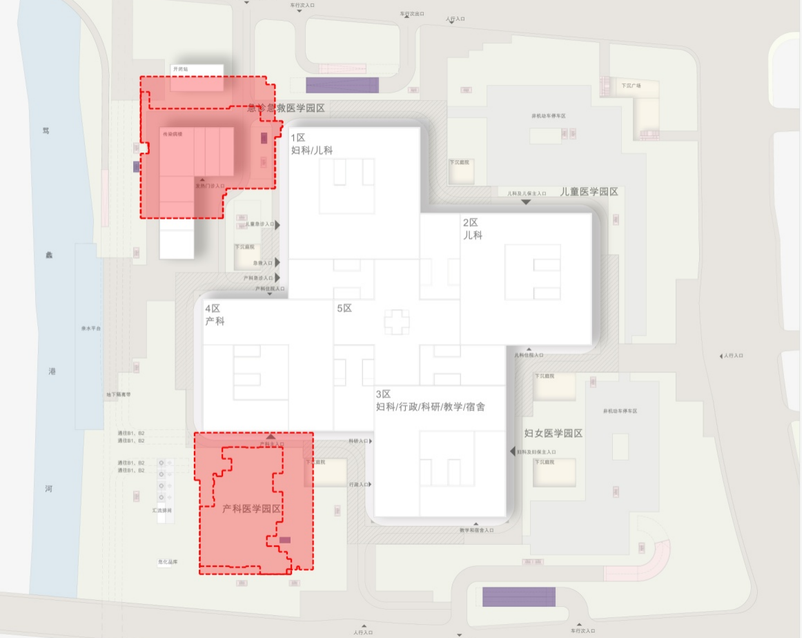 項(xiàng)目圍繞兒童、產(chǎn)科、保健、急救四大定位,打造四座子級(jí)醫(yī)學(xué)園區(qū)并在其中布置九個(gè)學(xué)科中心,四棟主樓圍繞中心依次排開(kāi)并通過(guò)中心大醫(yī)技平臺(tái)有機(jī)相連宛若旋轉(zhuǎn)的“十字風(fēng)車”同時(shí)象征著醫(yī)療標(biāo)志“+”,體現(xiàn)著醫(yī)患同心、生生不息的理念。