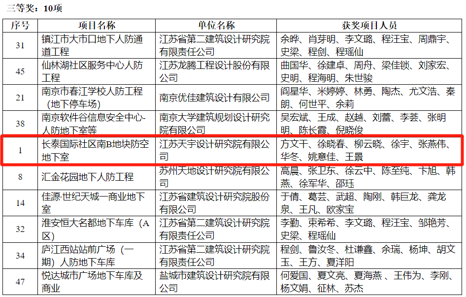 近日,2022年度江蘇省優(yōu)秀工程勘察設(shè)計(jì)行業(yè)獎(jiǎng)(部分類別)評(píng)審結(jié)果正式公布,江蘇天宇設(shè)計(jì)院積極參加本次評(píng)優(yōu)活動(dòng),并榮獲人防工程設(shè)計(jì)2個(gè)獎(jiǎng)項(xiàng)。其中,二等獎(jiǎng)1項(xiàng)、三等獎(jiǎng)1項(xiàng)。