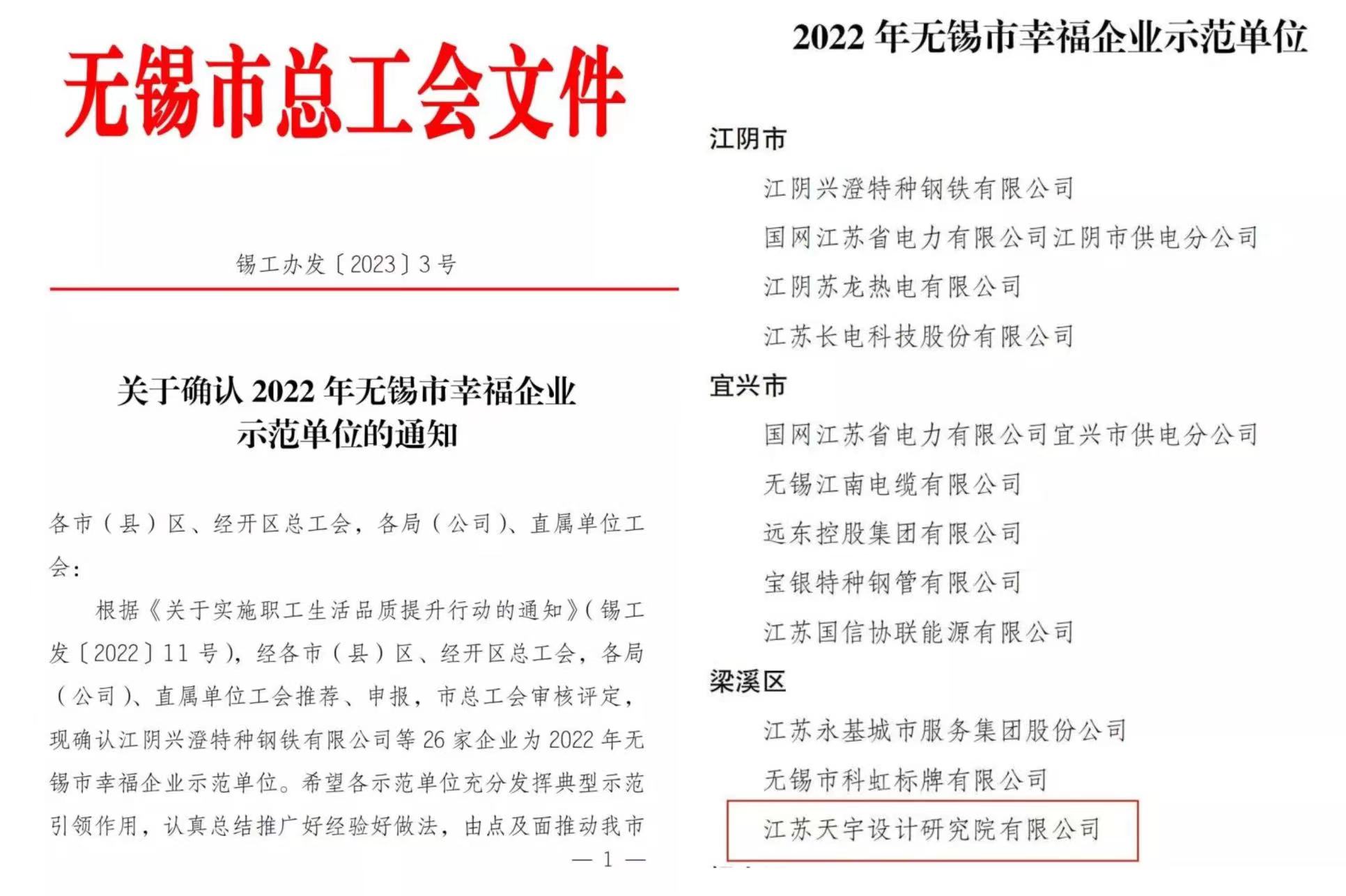 日前,無錫市總工會下發(fā)《關(guān)于確認(rèn) 2022 年無錫市幸福企業(yè)示范單位的通知》,全市26 家企業(yè)評為幸福企業(yè)示范單位,江蘇天宇設(shè)計研究院有限公司榜上有名。